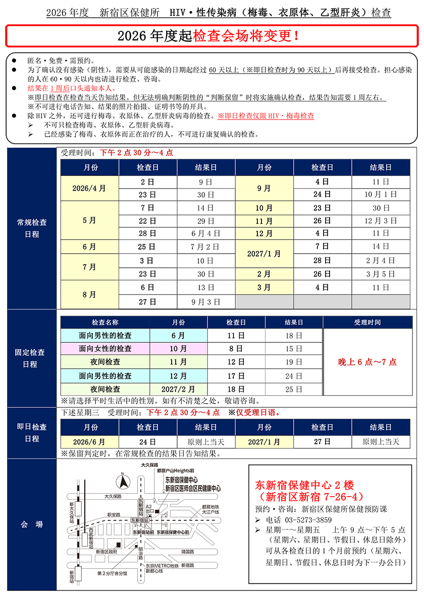 新宿区保健所在实施匿名、免费的HIV・性传染病检查(HIV・梅毒・乙型肝炎・衣原体)