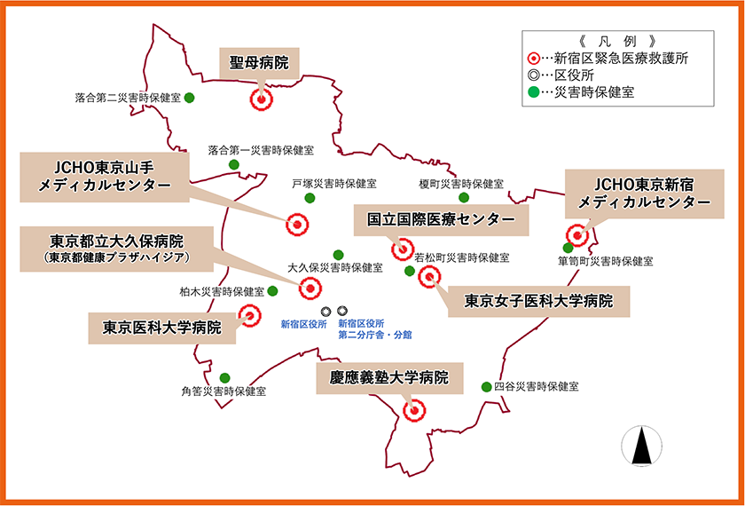 区は、発災後おおむね72時間までを目安に、新宿区緊急医療救護所を区内8つの病院の敷地内または近接地に開設します。自分や周囲の人で手当ができないケガや急病のときは、お近くの新宿区緊急医療救護所を受診してください。